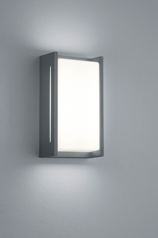 O candeeiro de exterior INDUS, fabricado em alumínio antracite e acrílico branco, proporciona a segurança necessária à volta da casa. No escuro, o candeeiro de parede revela todo o seu efeito e emite a luz uniformemente para a área exterior, criando uma intensidade luminosa eficaz e agradável. Quer instale a luminária na fachada da sua casa, na sua varanda ou na parede do seu pátio, esta luminária é versátil graças ao seu design simples e direto e ao seu grau de proteção IP 54.