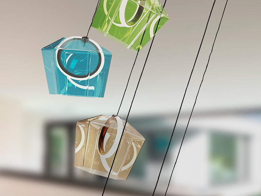 Candeeiro de 6 luzes, realizado em alumínio escovado, acabamento em tom bronze escuro. Abajures de vidro colorido em tons de champanhe, verde, azul, cinzento e âmbar, com aro interior de luz LED e difusor de silicone. 36W LED, 966 lm, 3000K