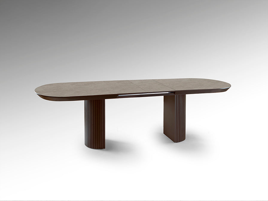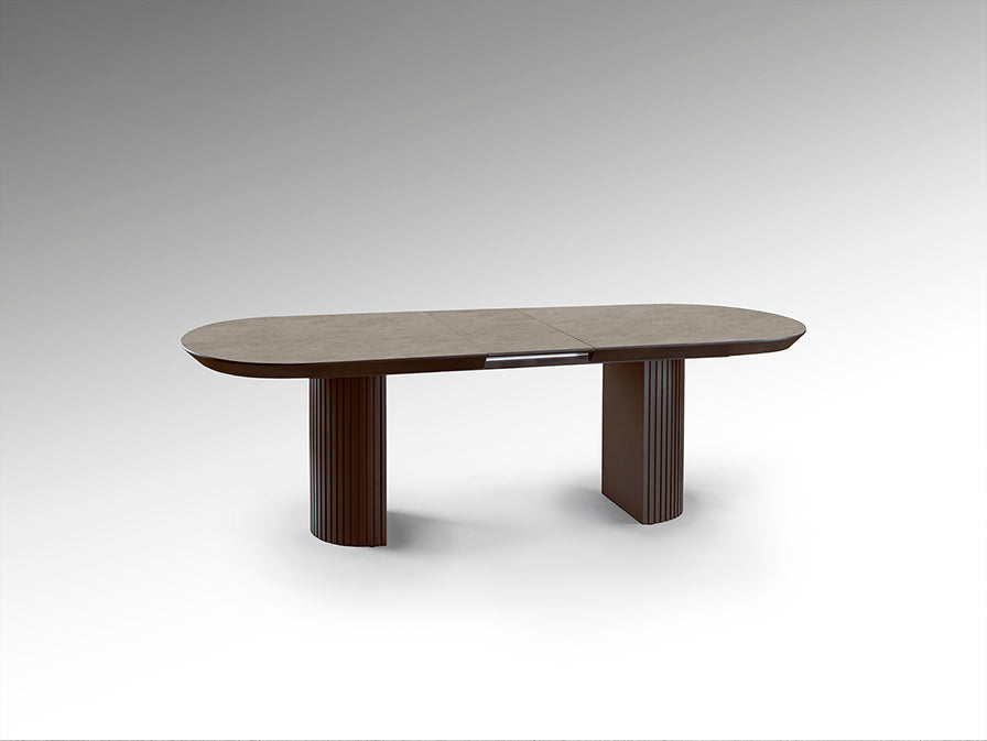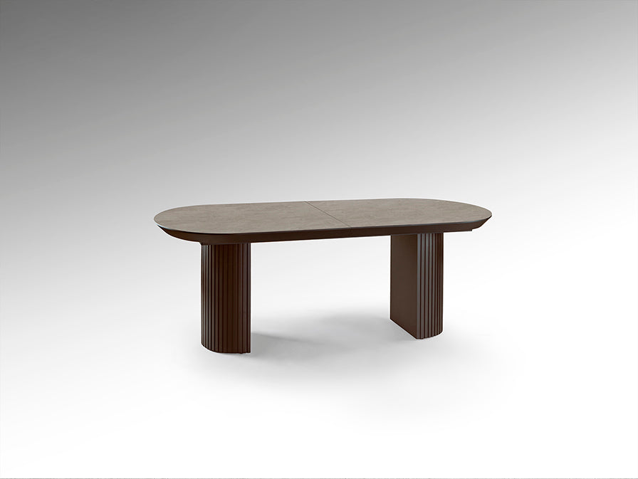 Mesa de jantar extensível, estrutura realizada em MDF, pés com superfície canelada, acabamento em castanho ferrugem. Tampo de MDF com superfície em melamina de alta resistência, acabamento pedra mate, com cantos em castanho ferrugem. Extensível até 2