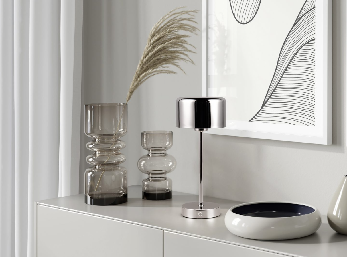 Quer seja um candeeiro de mesa encantador ou uma iluminação elegante no quarto - o candeeiro recarregável sem fios JEFF é versátil e flexível na sua utilização e satisfaz uma vasta gama de requisitos para iluminação móvel e independente da rede eléctrica em interiores. Graças ao seu design moderno e intemporal, a luz integra-se em quase todos os ambientes. Para além da sua aparência atraente, a luminária tem um regulador de intensidade de toque de 3 passos e fornece até 12 horas de luz sem encandeamento. O design metálico em cromado é moderno e realça com estilo o seu interior. A luminária também possui a moderna tecnologia LED, que se caracteriza por uma elevada qualidade de luz e eficiência energética. Em comparação com as fontes de luz de halogéneo convencionais, é possível poupar até 80% dos custos de energia. As fontes de luz LED também têm uma longa vida útil, produzem menos calor e protegem o ambiente.