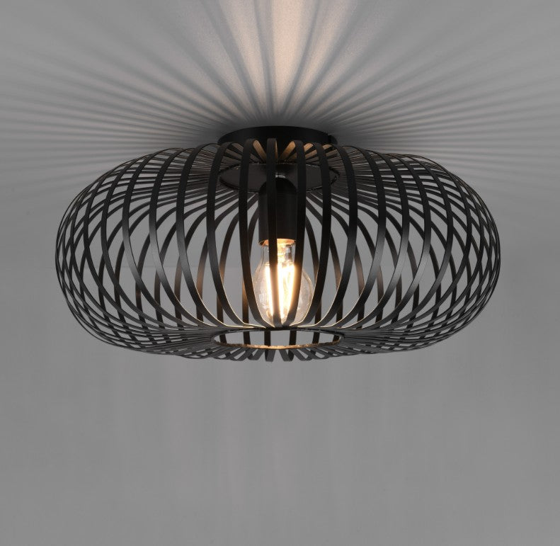 Os arcos de metal em filigrana do candeeiro de teto JOHANN unem-se a um abajur elegante, que proporciona um resultado de luz único! Colocado na sala de estar, o candeeiro projecta um grande padrão de luz e sombra no teto, criando uma atmosfera acolhedora. O design em preto mate cria um contraste de cores para interiores modernos.