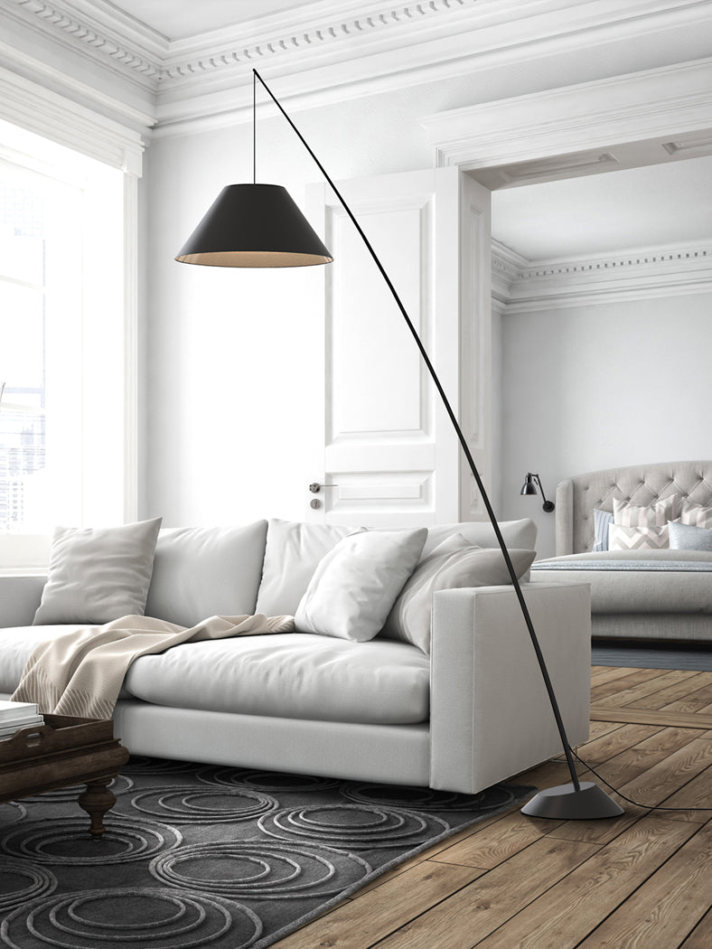 Candeeiro de pé com haste de fibra de carbono e base metálica, cor preta. Tela tecido cor preta.