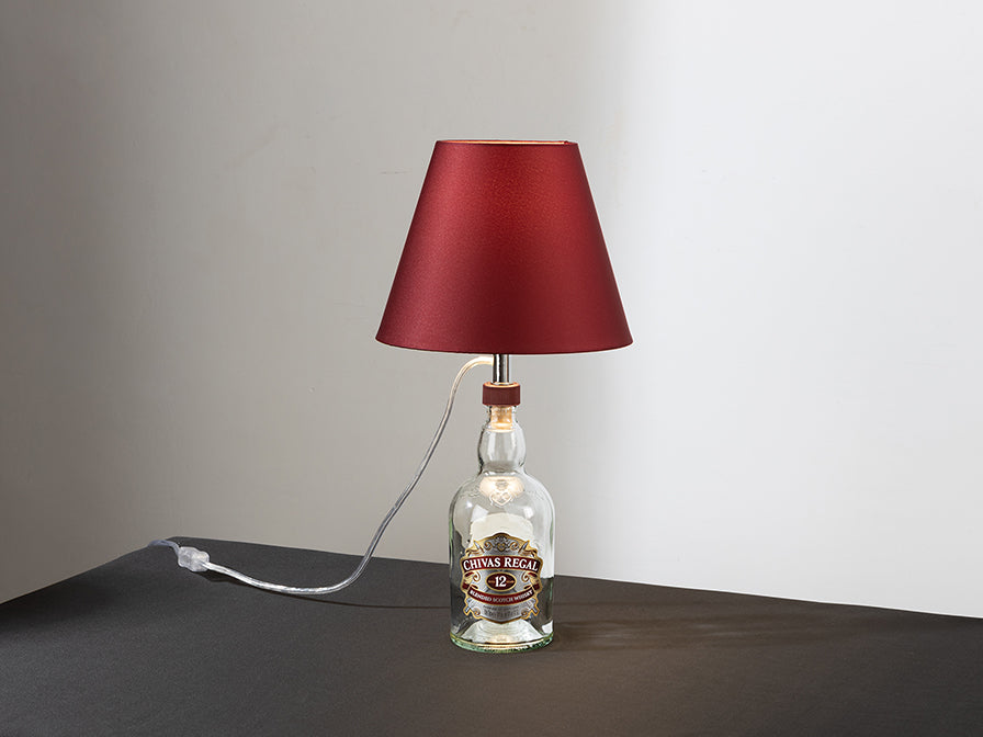Kit de iluminação para transformar garrafas de vinho ou licor em candeeiros de secretária. Inclui suporte de iluminação em acabamento crómio, lâmpada regulável e tela em tecido de seda cor grená.