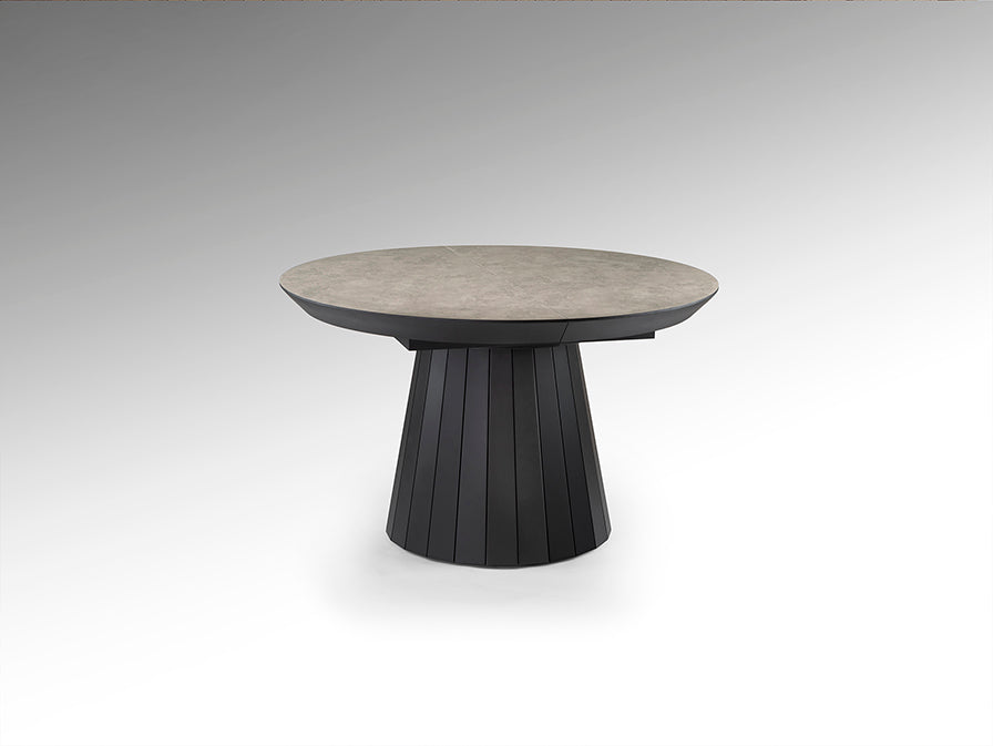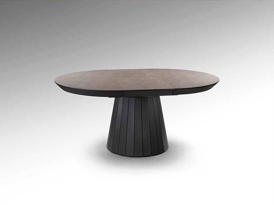 Mesa de jantar extensível, estrutura realizada em MDF com acabamento em preto mate. Tampo de MDF com superfície em melamina de alta resistência, acabamento pedra mate, com cantos em preto mate. Extensível até 230 cm.