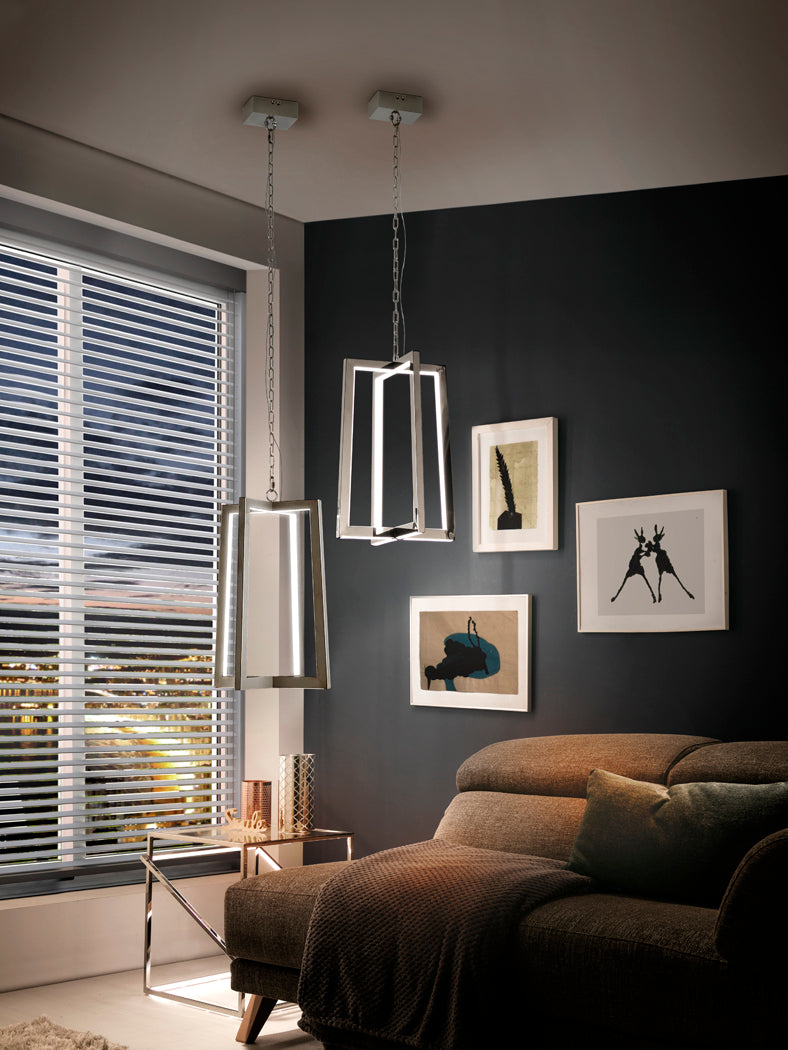 Candeeiro LED realizado em aço inoxidável polido. Faixas com iluminação LED ocultas por difusores de policarbonato branco. Faixa LED 23W, 3.000 K, 456 lm