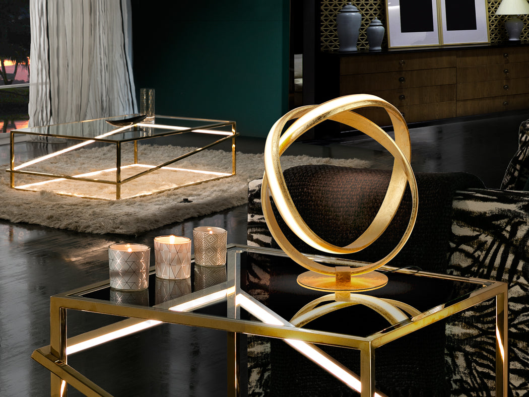 Candeeiro de secretária realizado em aço e alumínio acabamento FOLHA DE OURO. Difusor acrílico opalino. Iluminação LED 17 W. 900 lm. 3.000 K.