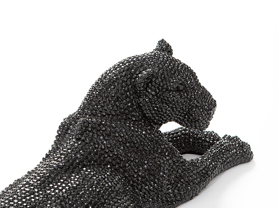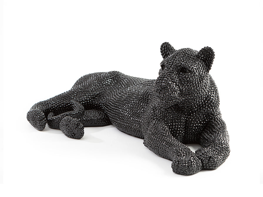 Figura pequena de leoa deitada, realizada em poliresina. Acabamento a preto brilhante com textura imitação de incrustações de pedras.
