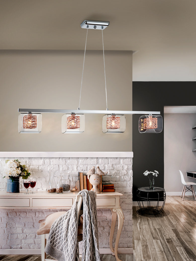Candeeiro de 4 luzes regulável em altura, realizado em metal acabamento crómio. Tulipas de vidro moldado, estrutura interior cúbica de arame de cobre.