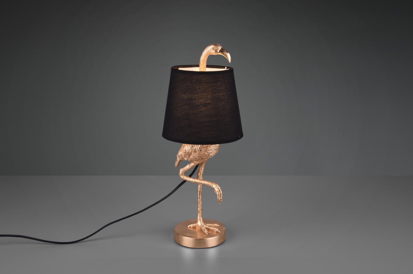 Com o invulgar candeeiro de mesa LOLA, pode trazer um verdadeiro destaque decorativo para a sua casa. Com o seu design criativo de flamingo, o candeeiro de mesa é um atrativo elegante, quer esteja ligado ou desligado. Não só na sala de estar, mas também no quarto de dormir, no quarto das crianças ou na sala de festas, o candeeiro de mesa proporciona uma iluminação agradável e a luz ambiente certa. O design em dourado com o abajur em tecido preto pode ser facilmente combinado com estilos de mobiliário existentes e cria um aspeto moderno. Para uma iluminação economizadora de energia, recomenda-se a utilização de uma lâmpada LED. Estas são uma óptima alternativa às lâmpadas de halogéneo convencionais e representam uma elevada qualidade de luz e uma poupança de energia de até 80%. Além disso, as lâmpadas LED ajudam-no a beneficiar de uma longa vida útil, de uma baixa produção de calor e, ao mesmo tempo, protegem o ambiente.