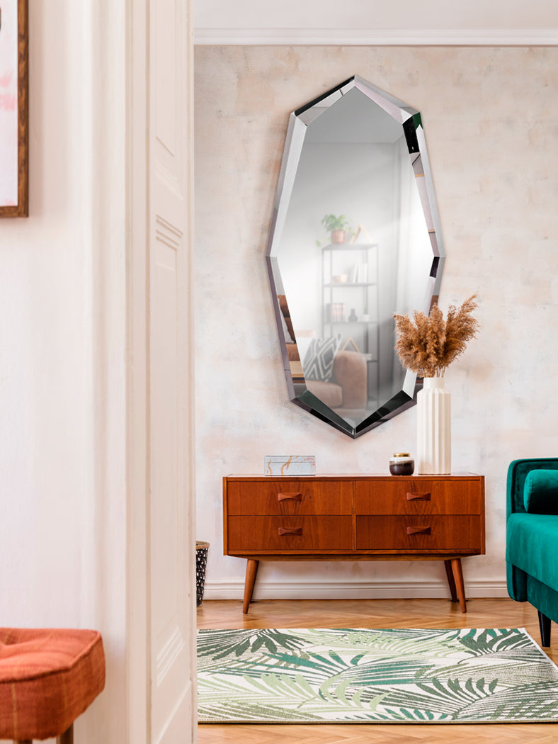 Espelho com moldura poliédrica de aço polido alto brilho. Lua central. Preparado para pendurar em posição horizontal ou vertical.