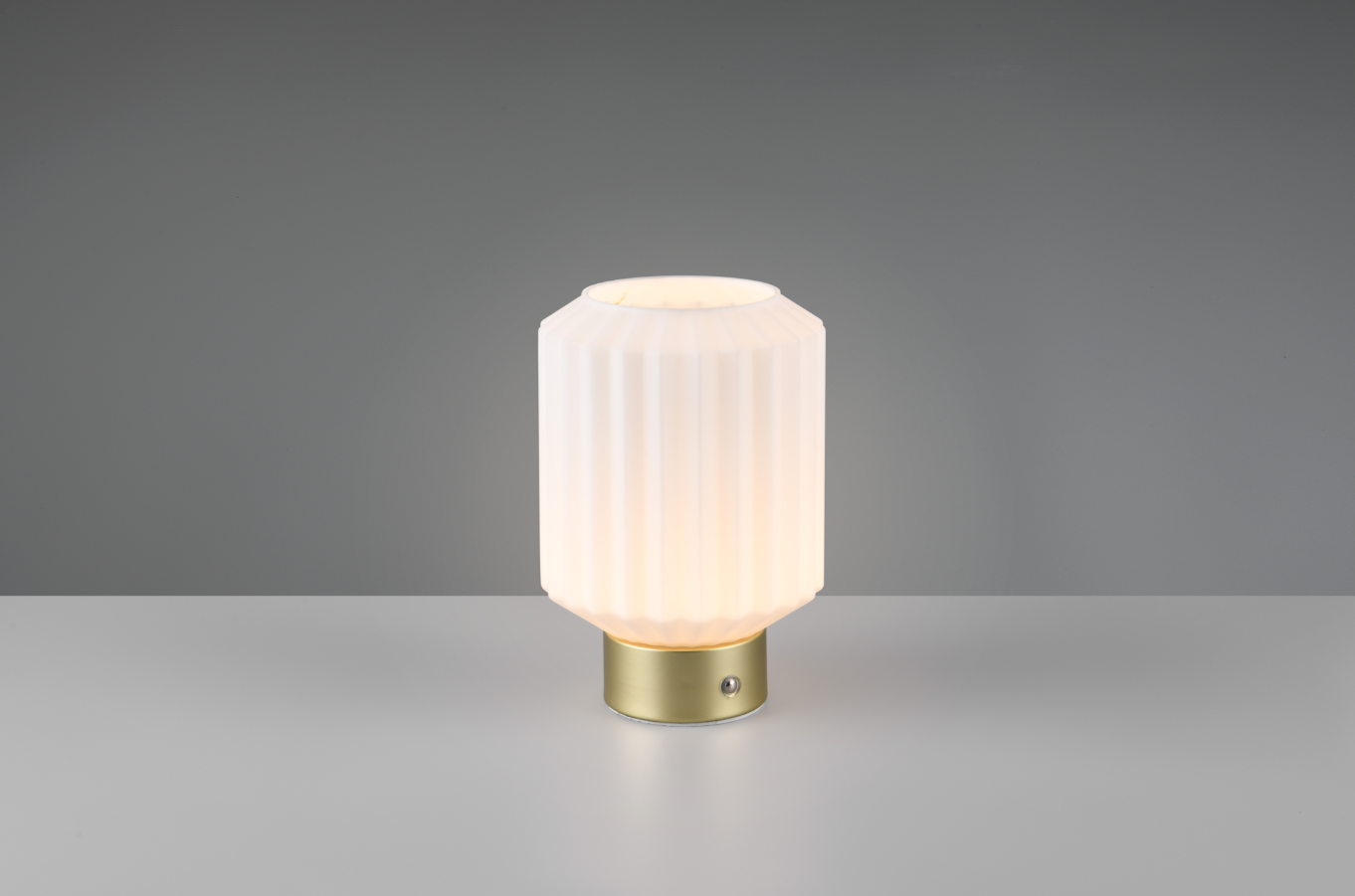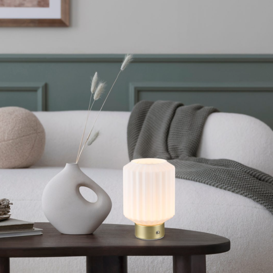 A lâmpada recarregável LORD pode ser utilizada onde quer que seja necessária uma luz bonita, independentemente de uma tomada eléctrica. O abajur de vidro dá um toque de elegância e estilo a qualquer interior. Basta um toque suave na base do candeeiro para regular a luminosidade em três níveis. Isto permite-lhe definir a luz perfeita para se adequar ao seu estado de espírito e às suas necessidades. O design moderno em vidro branco e o corpo a condizer em latão mate integram-se perfeitamente em qualquer interior. A luminária também possui a moderna tecnologia LED, que se caracteriza por uma elevada qualidade de luz e eficiência energética. Em comparação com as fontes de luz de halogéneo convencionais, é possível poupar até 80% dos custos de energia. Com as fontes de luz LED, também beneficia de uma longa vida útil e de uma baixa produção de calor, protegendo o ambiente.