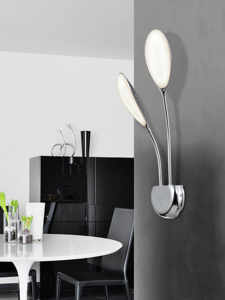 Candeeiro de parede LED, realizado em alumínio e metal cromado. Difusor opalino de policarbonato. 2 luzes LED de 5,3W. 742 lm. 4000K