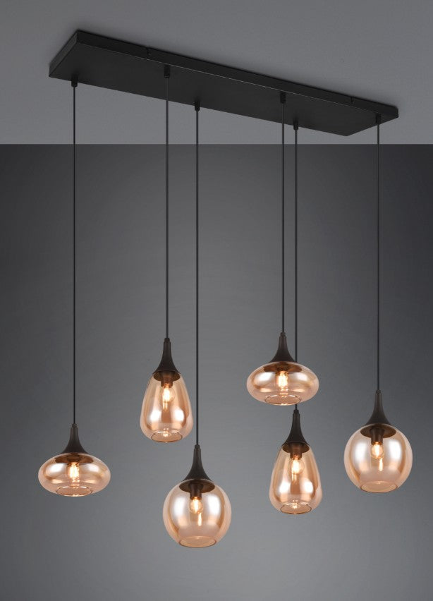 A luminária suspensa LUMINA é um atrativo especial na sua sala de estar, graças aos seus elegantes abajures de vidro! As diferentes formas dos três abajures e a composição de metal e vidro criam uma atmosfera de iluminação bonita e única que dá um toque moderno à sua sala de jantar. Graças ao esquema de cores preto mate e aos tons de vidro âmbar, existe uma grande margem para outras cores, tornando-o maravilhosamente fácil de integrar em conceitos de vida existentes. A utilização de fontes de luz LED é recomendada para uma iluminação economizadora de energia. Estas são uma alternativa ideal às fontes de luz de halogéneo convencionais e oferecem uma elevada qualidade de luz e uma poupança de energia até 80%. Com as fontes de luz LED, também beneficia de uma longa vida útil e de uma baixa produção de calor, protegendo o ambiente.
