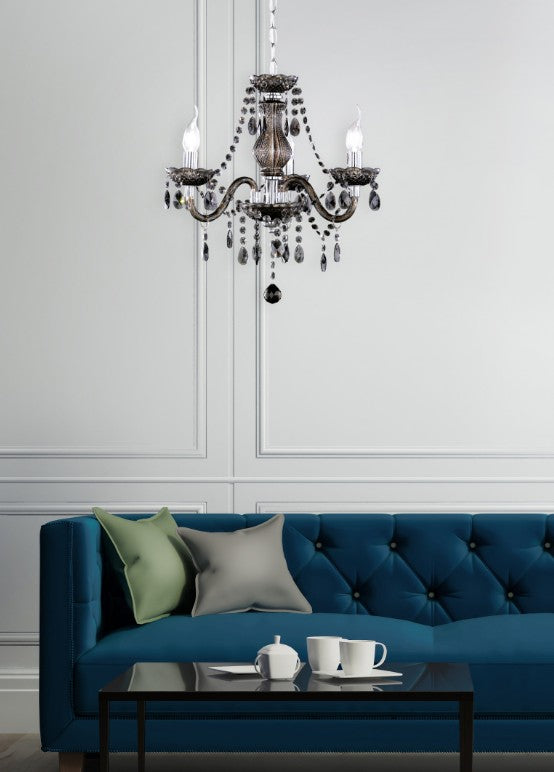 O lustre cintilante LÜSTER atrai a atenção de todos. Este lustre glamoroso enquadra-se perfeitamente em estilos de decoração modernos e clássicos e impressiona pelo seu design de bom gosto e condições de iluminação de primeira classe. A luminária de 3 chamas tem uma suspensão de 150 cm e um diâmetro de 46 cm. O esquema de cores em metal cromado e o cristal acrílico preto pendurado complementam-se na perfeição e criam um aspeto geral harmonioso. Para uma iluminação economizadora de energia, recomenda-se a utilização de uma lâmpada LED. Estas são uma óptima alternativa às lâmpadas de halogéneo convencionais e representam uma elevada qualidade de luz e uma poupança de energia de até 80%. Além disso, as lâmpadas LED ajudam-no a beneficiar de uma longa vida útil, de uma baixa produção de calor e, ao mesmo tempo, protegem o ambiente.