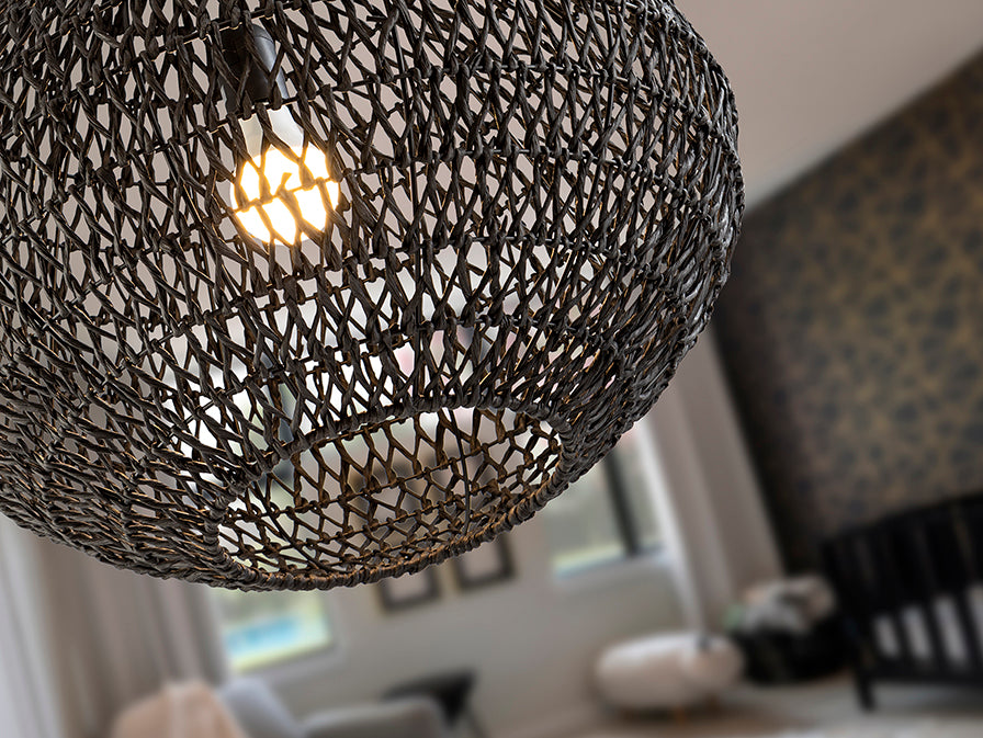 Candeeiro de 1 luz realizado em metal e abajur de corda de papel entrançado. Acabamento preto.