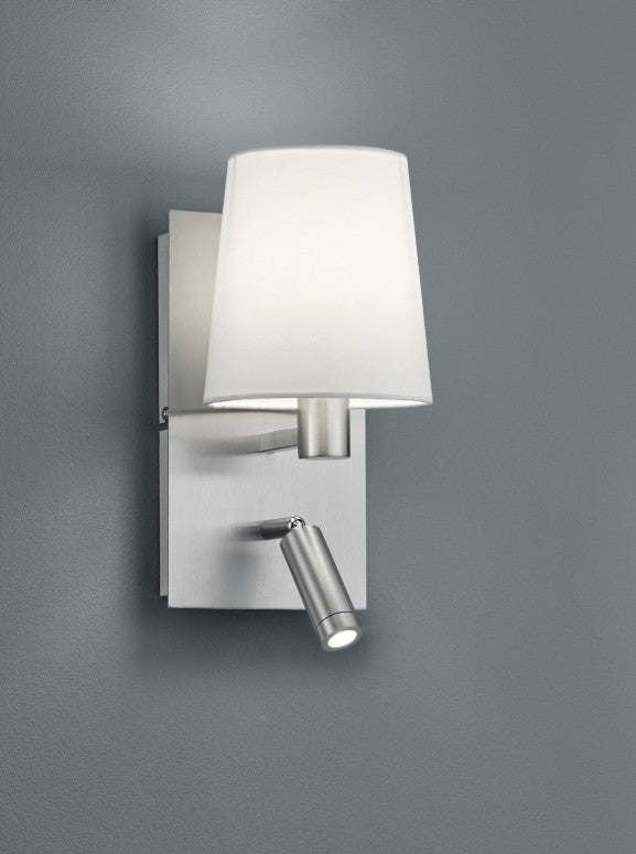 A luminária de parede MARRIOT com braço de leitura impressiona pelo seu design atraente e pela sua utilização cómoda e flexível. O braço de leitura giratório permite direcionar o feixe de luz e pode ser ajustado em conformidade. Ambas as fontes de luz podem ser ligadas e desligadas separadamente através de interruptores integrados. Idealmente, o MARRIOT deve ser colocado ao lado da cama no quarto, uma vez que a combinação da luz suave do abajur em tecido e do braço de leitura flexível torna a luminária ideal como luz de cabeceira e de leitura. A MARRIOT também está equipada com a funcionalidade FLEXconnect, de modo a poder ser fixada à parede em qualquer posição graças à saída de cabo integrada e ligada através de um cabo de alimentação ou é adequada para uma ligação fixa sem um cabo de alimentação. A combinação de níquel mate e branco tem um efeito discreto e intemporal, o que significa que a luminária de parede pode ser facilmente integrada em esquemas de cores existentes.