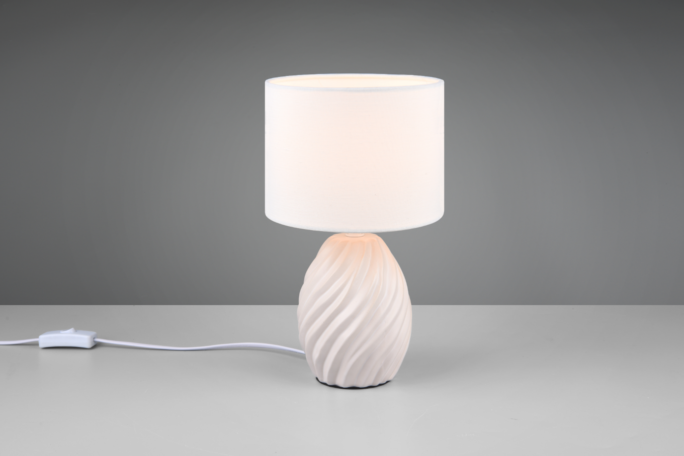 O candeeiro de mesa MELVA combina um design elegante com uma elegância funcional. A sua sofisticada mistura de materiais de tecido e cerâmica torna-o um verdadeiro chamariz em qualquer divisão. A base em cerâmica apresenta uma estrutura ondulada única, que confere ao design uma profundidade especial e cria uma fascinante interação de luz e sombra. O abajur em tecido de alta qualidade difunde uma luz agradável e quente e cria uma atmosfera acolhedora. O interrutor com fio integrado é prático e fácil de utilizar, facilitando a ligação e a desativação da luz. Com a MELVA, a sua casa ganha em estilo. A base em cerâmica branca mate harmoniza-se perfeitamente com o abajur em tecido branco e integra-se sem esforço em qualquer ambiente. A utilização de fontes de luz LED é recomendada para uma iluminação economizadora de energia. Estas são uma alternativa ideal às fontes de luz de halogéneo convencionais e oferecem uma elevada qualidade de luz e uma poupança de energia até 80%. Com as fontes de luz LED, também beneficia de uma longa vida útil e de uma baixa produção de calor, protegendo o ambiente.
