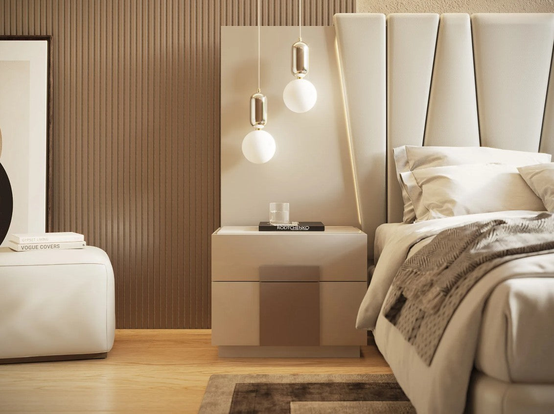 Mesa de Cabeceira branca com detalhes em metalizado terra. No seu tampo pode colocar o seu relógio, telemóvel ou um pequeno candeeiro. Nas suas duas gavetas poderá armazenar pequenas peças de roupa.