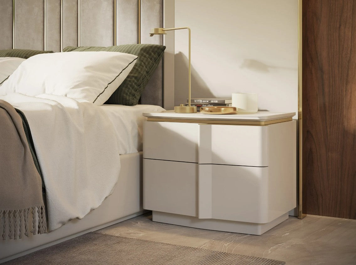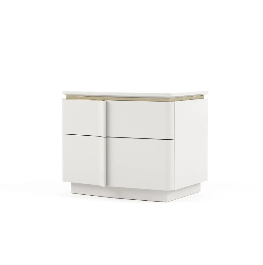Mesa de cabeceira branca, com um pequeno detalhe em dourado e design curvo. Uma peça de excelência para combinar com a restante decoração do seu quarto moderno.
