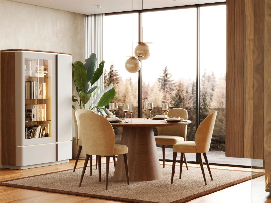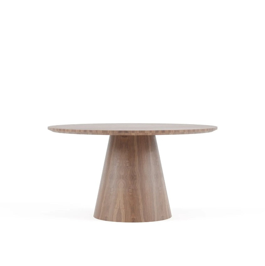 Mesa de jantar redonda, em madeira, de estilo simples e moderno. Esta peça vai funcionar em total harmonia com a restante decoração da sua Sala de Jantar.