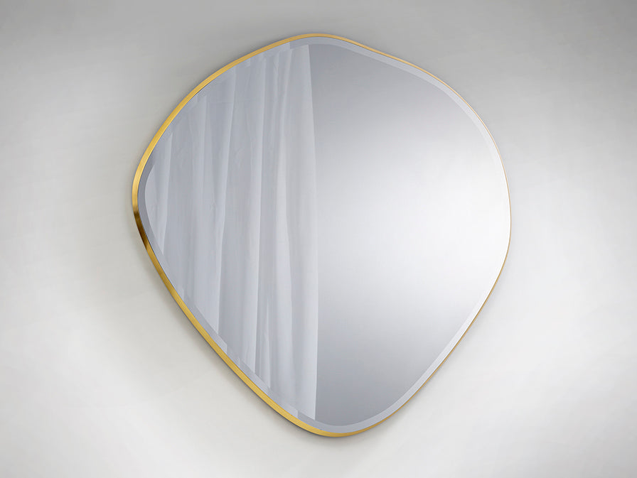 spelho com forma oval irregular, com moldura de DM com acabamento em FOLHA DE DOURADO e vidro biselado.