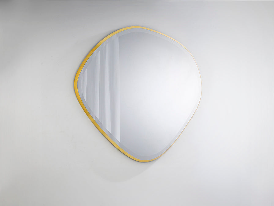 Espelho com forma oval irregular, com moldura de DM com acabamento em FOLHA DE DOURADO e vidro biselado.