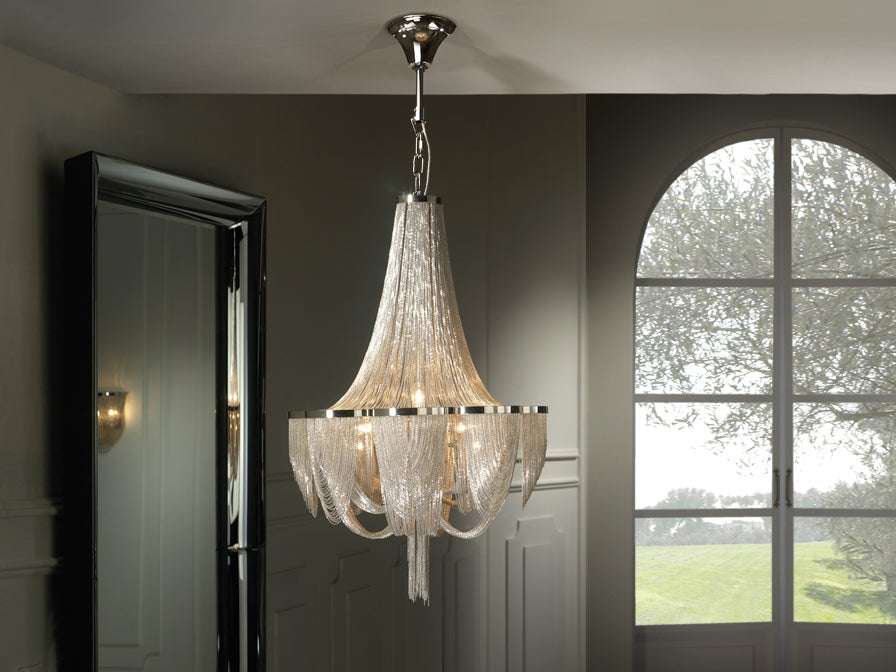 Candeeiro de 10 luzes, composto por finas correntes de metal acabamento níquel que formam o corpo do candeeiro.