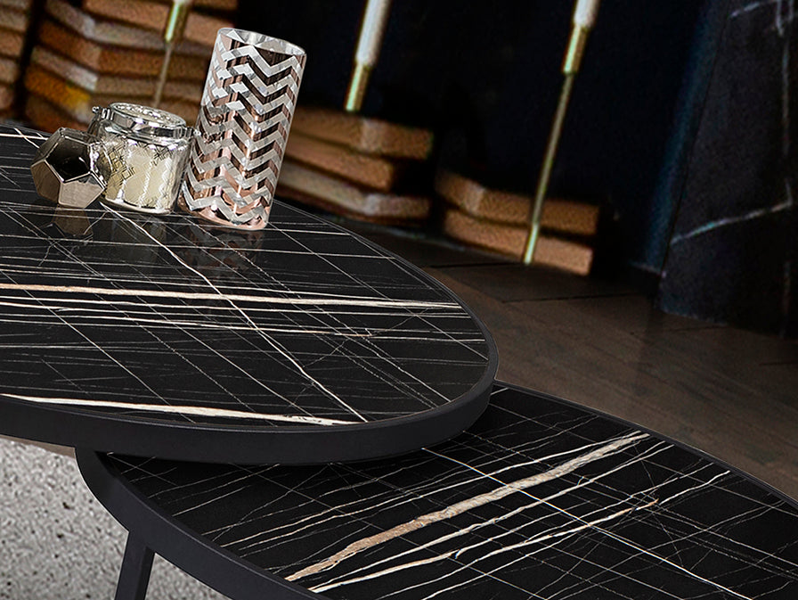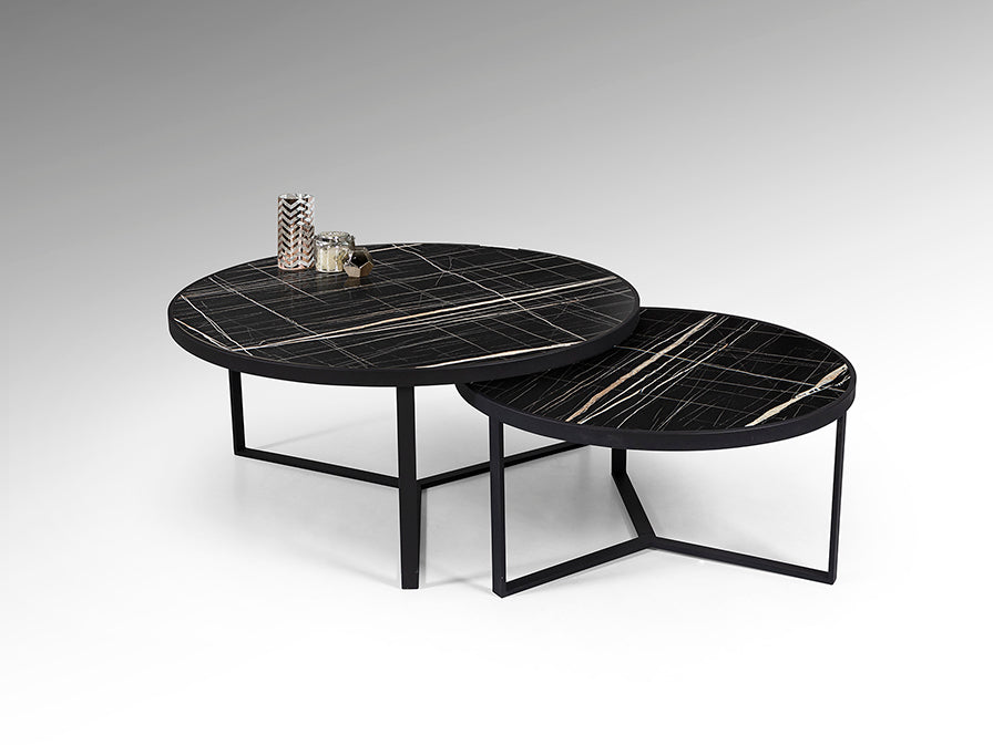 Par de mesas de apoio realizadas em metal, acabamento preto mate. Tampo de DM com superfície em melamina de alta resistência, acabamento mármore preto brilho.