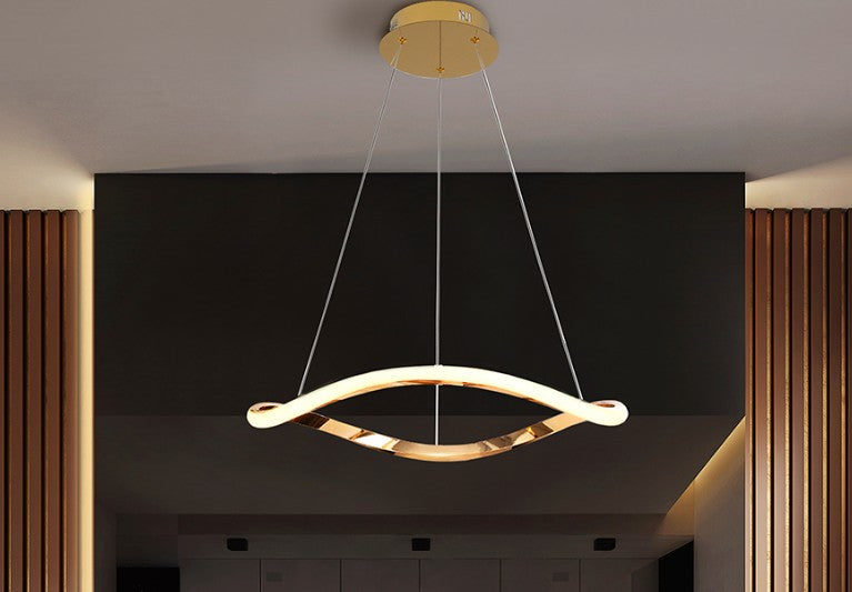 Candeeiro com um aro curvo. Realizado em metal e alumínio. Acabamento ouro rosa brilho. Difusor de silicone opalino. Altura regulável. 27W LED, 1.600 l, 3.000K