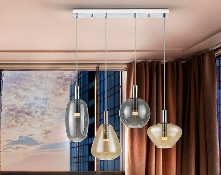 Candeeiro de 4 luzes, realizado em metal cromado. Abajures combinados em vidro âmbar e smoke, com difusor em acrílico opalino. Altura regulável. 20W LED, 1800 lm, 3000 K.
