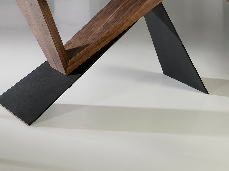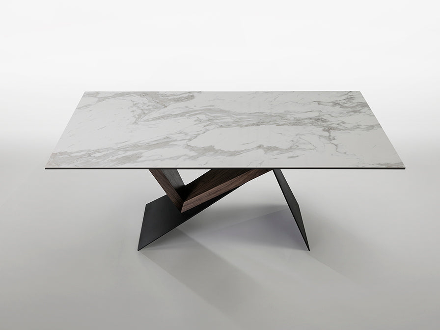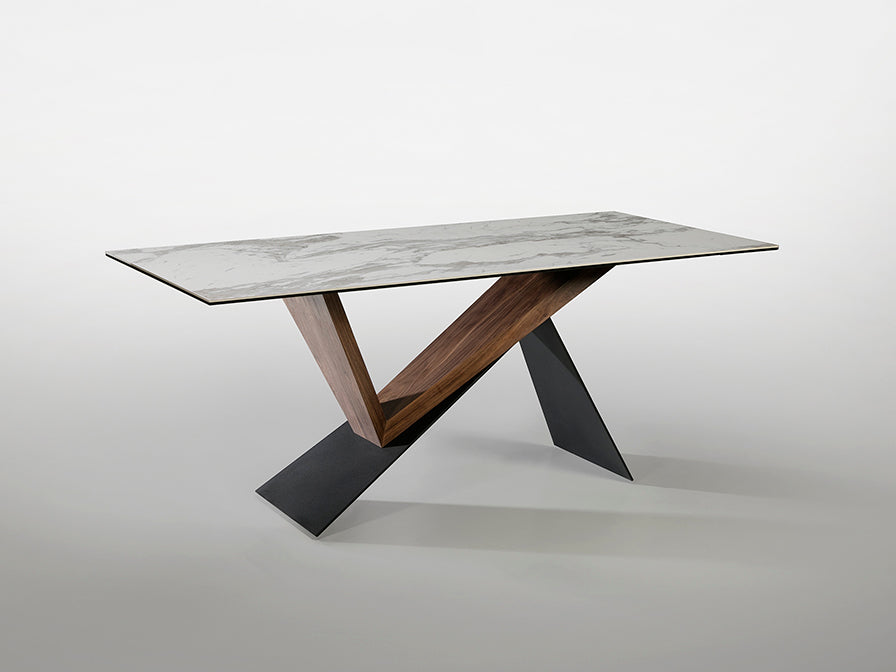 Mesa de sala de jantar em metal, lacado em preto mate, e madeira de nogueira. Tampo laminado de porcelânico e vidro, com decoração mármore branco.