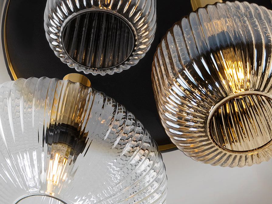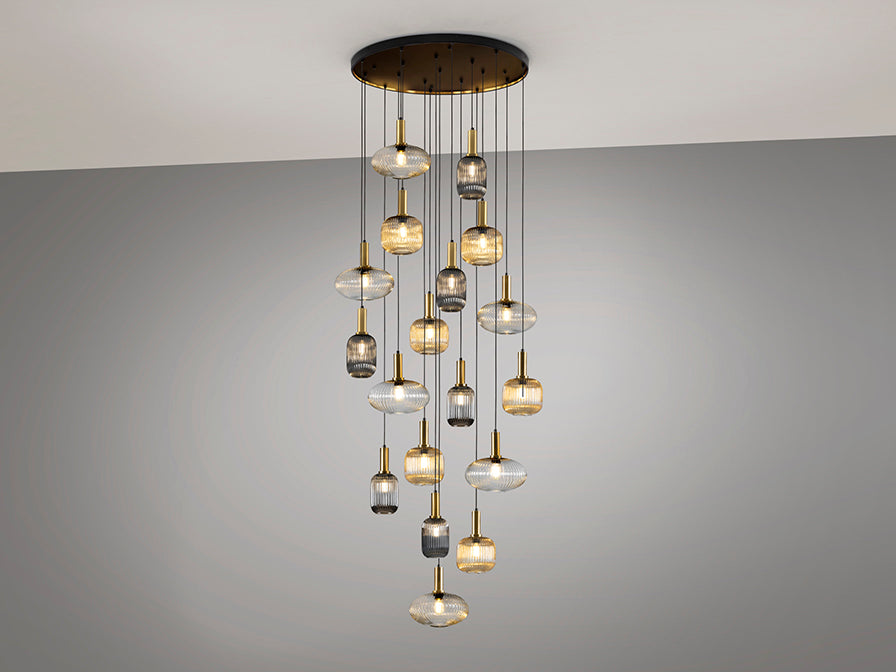 Candeeiro de 18 luzes realizado em metal com acabamento preto mate, com detalhes de latão acetinado. Abajures de vidro moldado com acabamento transparente, âmbar e cinzento smoke espelhado. Regulável em altura.