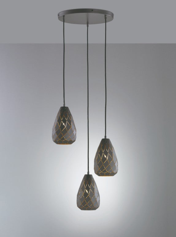 A luminária suspensa de três luzes ONYX impressiona pelo seu design de bom gosto com formas geométricas e efeitos de luz e cor únicos. Cada pendente é composto por numerosos losangos e cria uma aparência atractiva. A luz não é apenas intensamente difundida para baixo, mas também cria um brilho multifacetado. O design geométrico dos pendentes individuais, em combinação com uma suspensão assimétrica, cria um atrativo individual e permite que espaços inteiros brilhem com um novo esplendor. A luminária destaca-se particularmente bem quando é montada no centro de uma sala de jantar, por cima de uma mesa de jantar redonda. Isto cria harmonia e uma impressão geral harmoniosa. O pendente tem um acabamento simples em cor antracite no exterior e dourado no interior, criando um efeito de iluminação agradável e acolhedor.