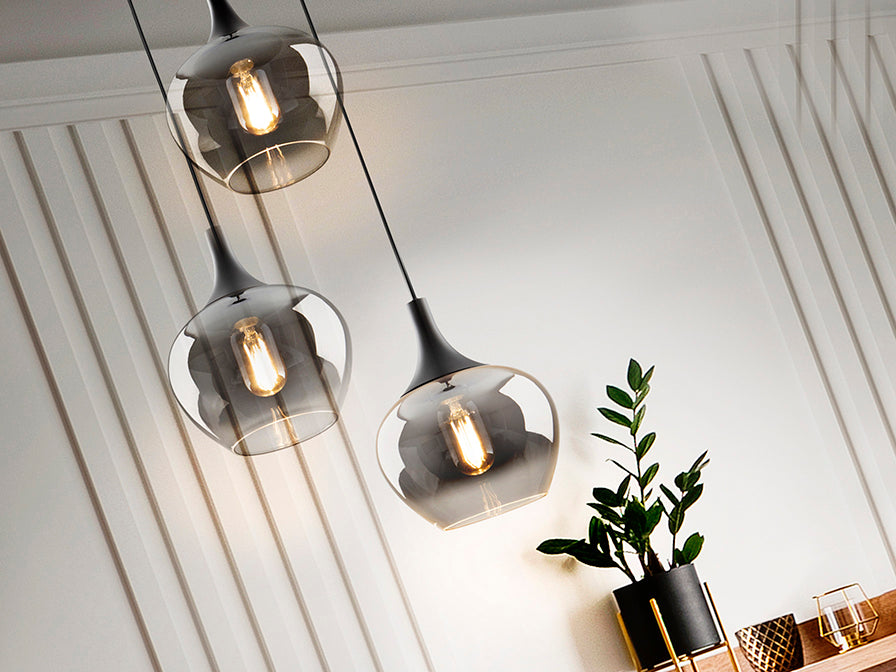 Candeeiro de 3 luzes, realizado em metal acabamento preto mate. Abajur Ø19 cm em vidro moldado smoke degradê. Regulável em altura.