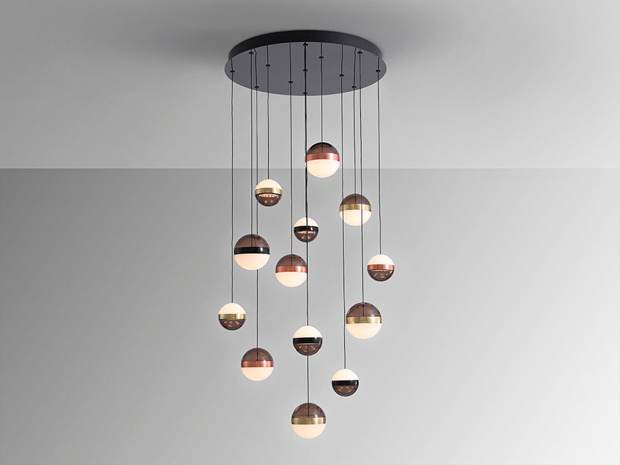 Candeeiro de 13 L. LED, em metal preto. Abajures de Ø12 cm e 15 cm, em policarbonato smoke e vidro marmoreado. Aros de metal em cobre, latão acetinado e cromado preto. REGULÁVEL. 108W LED. 3000K. 5.030 lm. Driver TRIAC e SET REGULADO