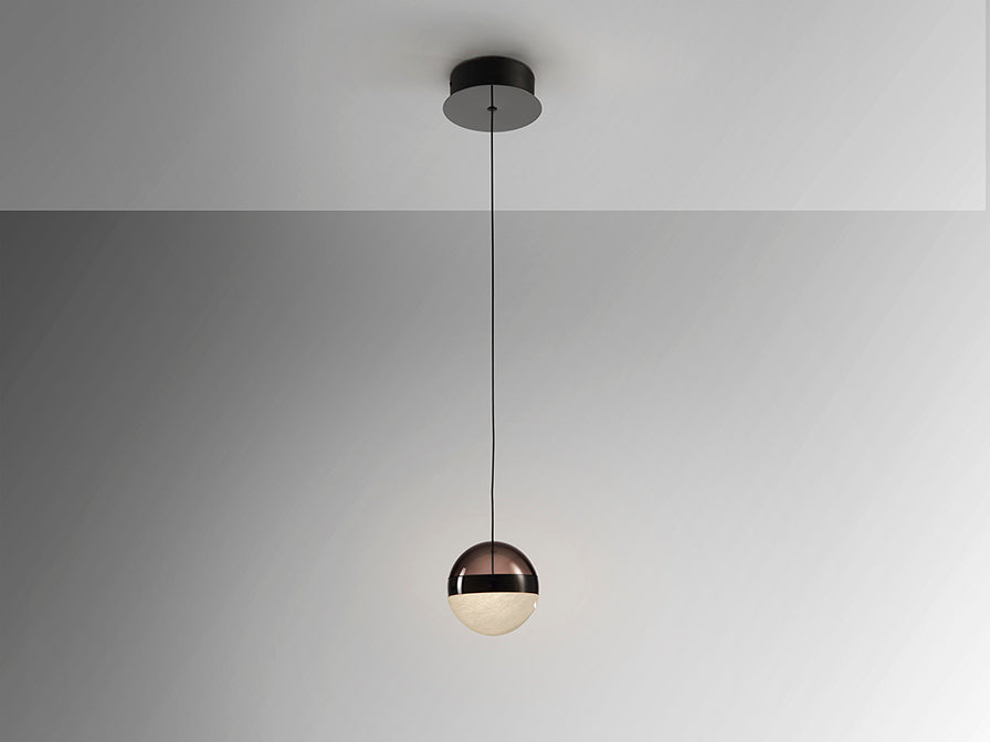 Candeeiro LED realizado em metal acabamento preto. Abajur de Ø12 cm, em policarbonato smoke e vidro marmoreado, com aro de metal acabamento cromado preto. 7W LED. 3000K. 318 lm.