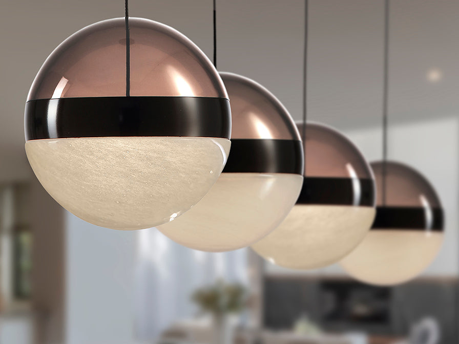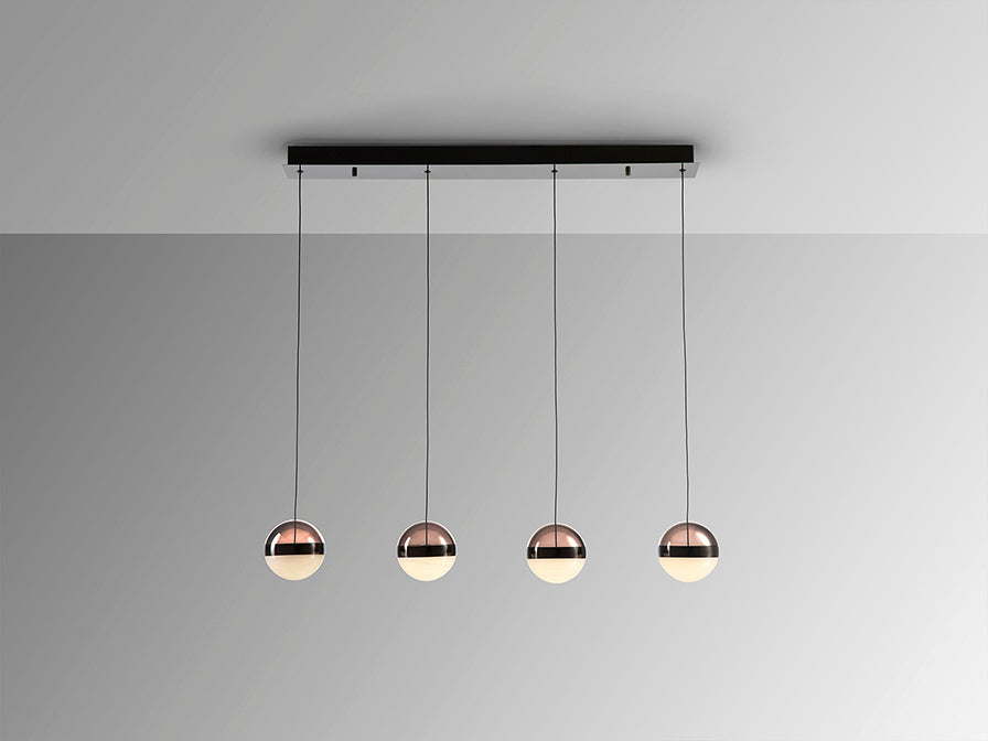 Candeeiro de 4 luzes LED, realizado em metal, acabamento preto. Abajures de Ø12 cm, em policarbonato smoke e vidro marmoreado, com aros de metal acabamento cromado preto. REGULÁVEL. 29W LED. 3000K. 1.304 lm.