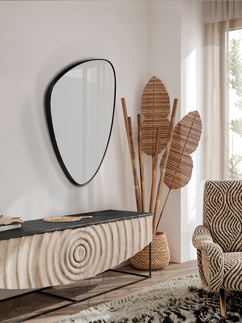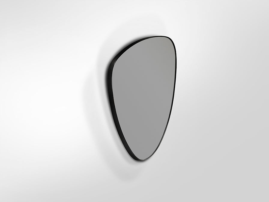 Espelho triangular com moldura de DM com acabamento preto mate. Preparado para pendurar em posição horizontal ou vertical.
