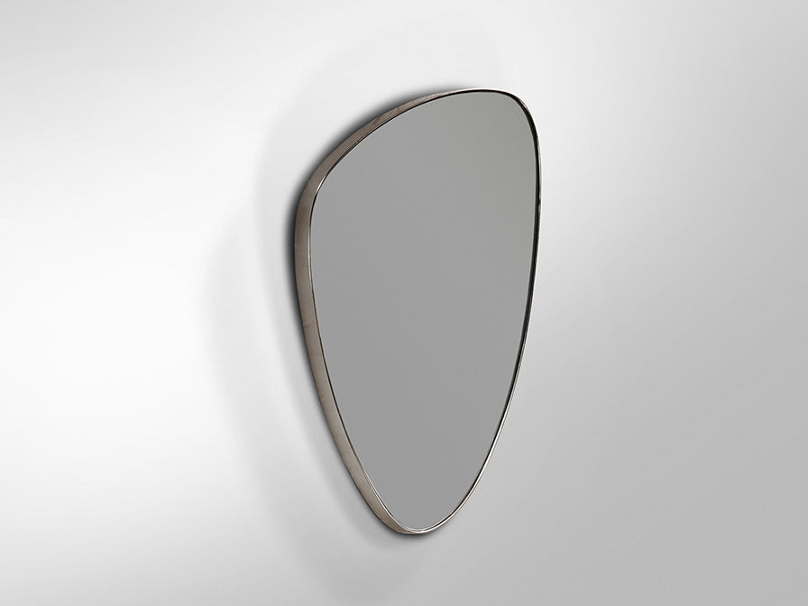 Espelho triangular com moldura de DM com acabamento em FOLHA DE PRATA. Preparado para pendurar em posição horizontal ou vertical.