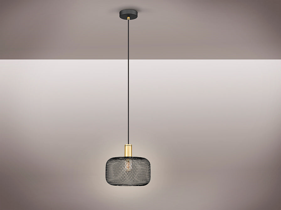 Candeeiro de 1 luz realizado em metal, com abajur de malha metálica, acabamentos pintura dourado e preto mate. Cabo revestido tecido preto.