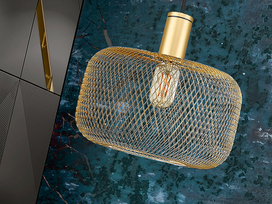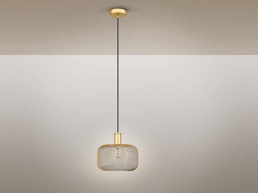 Candeeiro de 1 luz realizado em metal, com abajur de malha metálica, acabamentos pintura dourado. Cabo revestido tecido preto.