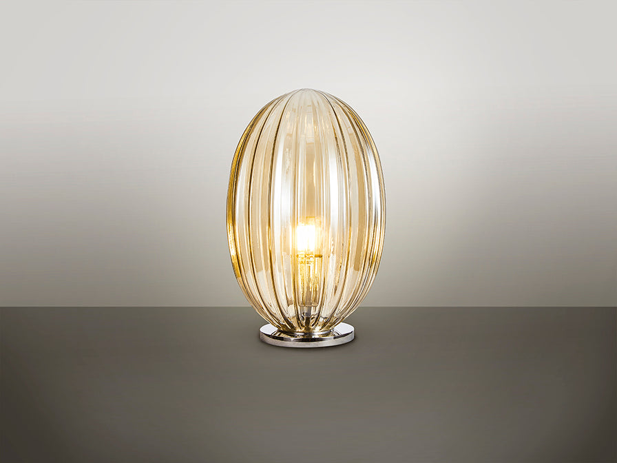 Candeeiro de secretária de 1 luz realizado em metal acabamento crómio. Abajur pequeno de vidro tom conhaque.