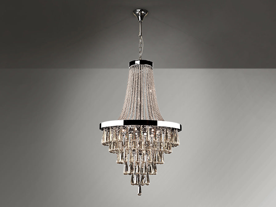 Candeeiro de 22 luzes realizado em metal acabamento crómio brilho, correntes de bolas de vidro e lágrimas grandes de vidro fumado facetado K9. Incluindo forro de veludo preto para corrente. REGULÁVEL. Inclui comando à distancia.