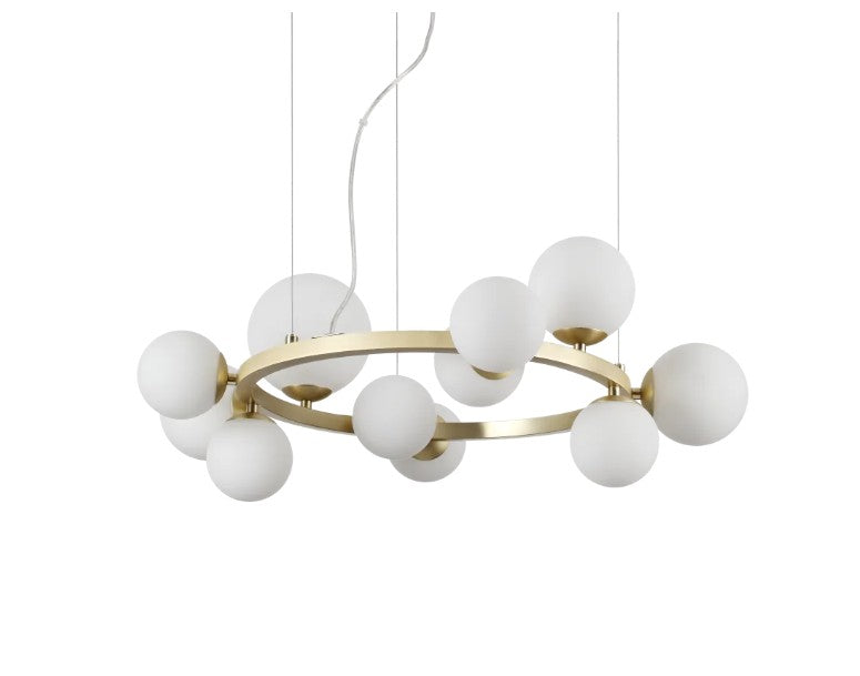 Estrutura metálica com estrutura linear de seção redonda ou estrutura redonda de seção quadrada. Difusores de vidro soprado. Cabos de aço revestidos de borracha. Fio elétrico de PVC. Cores: preto fosco ou latão acetinado. Ø 730 x H min 380 / max 2300 mm G9 máx. 11 x 15 W 3.000 K