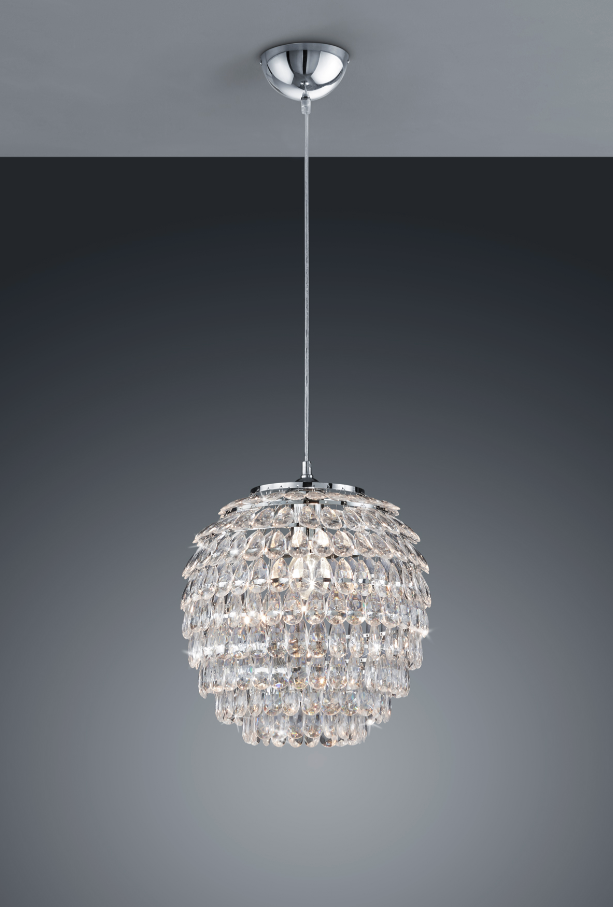 O candeeiro suspenso PETTY impressiona com muito brilho e glamour, o que o torna um ótimo chamariz para salas de estar ou de jantar. O candeeiro extravagante é composto por pendentes de plástico brilhante, nos quais a luz refracta maravilhosamente e projecta sombras fascinantes. O diâmetro é de 35 cm. O candeeiro suspenso foi concebido em metal de cor cromada. As pedras acrílicas brilhantes conferem à luminária um estilo glamoroso e brilham através da luz no centro. Para uma iluminação economizadora de energia, recomenda-se a utilização de uma lâmpada LED. Estas são uma óptima alternativa às lâmpadas de halogéneo convencionais e representam uma elevada qualidade de luz e uma poupança de energia de até 80%. Além disso, as lâmpadas LED ajudam-no a beneficiar de uma longa vida útil, de uma baixa produção de calor e, ao mesmo tempo, protegem o ambiente.