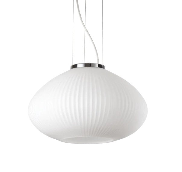 Armação de metal chapeado. Difusor em vidro soprado branco com decoração em relevo. Fio elétrico de PVC transparente. Cores: cromo ou latão acetinado. Ø 350 x H min 290 / max 2230 mm E27 máx. 1 x 60 W