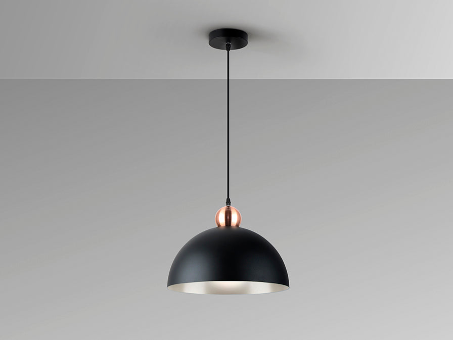 Candeeiro de 1 luz realizado em metal com acabamento preto mate e cobre. Regulável em altura. 1 E27