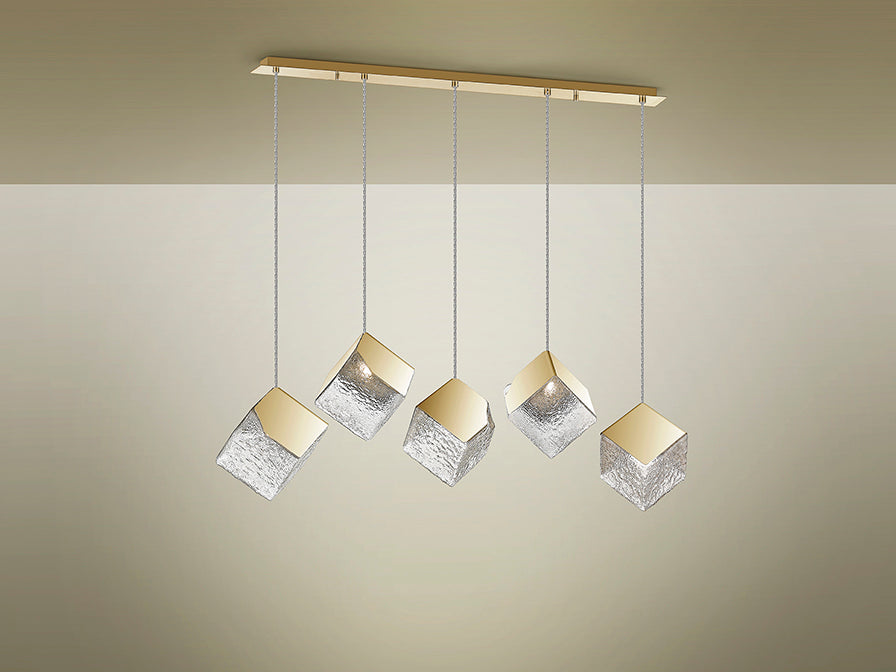 Candeeiro de 5 luzes, realizado em metal e aço acabamento dourado. Abajur cúbico de vidro texturizado. Regulável em altura.