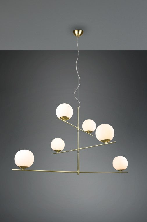 Simples e absolutamente elegante! Quer se trate de um estilo de interior simples e direto ou de algo mais divertido - as luminárias da série PURE proporcionam acentos decorativos simples para dar um toque de elegância a qualquer visual. O estilo simples é absolutamente contemporâneo e pode ser combinado com elementos marcantes e discretos. Os elementos giratórios da luminária pendente de seis chamas podem ser alinhados individualmente. Assim, a luminária é perfeita para iluminar a mesa de jantar e para sublinhar o seu próprio estilo de vida. O design purista-minimalista do PURE é uma mistura de ótica de metal nobre em latão mate combinada com vidro branco.