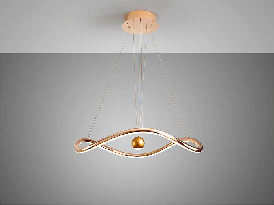 Candeeiro realizado em alumínio e aço, acabamento em dourado brilho. Difusor de silicone opalino. Permite regular a altura manualmente, puxando a esfera central. Iluminação LED 50W, CCT: 2700-5000 K, 3.100 lm. REGULÁVEL. Inclui comando à distância.